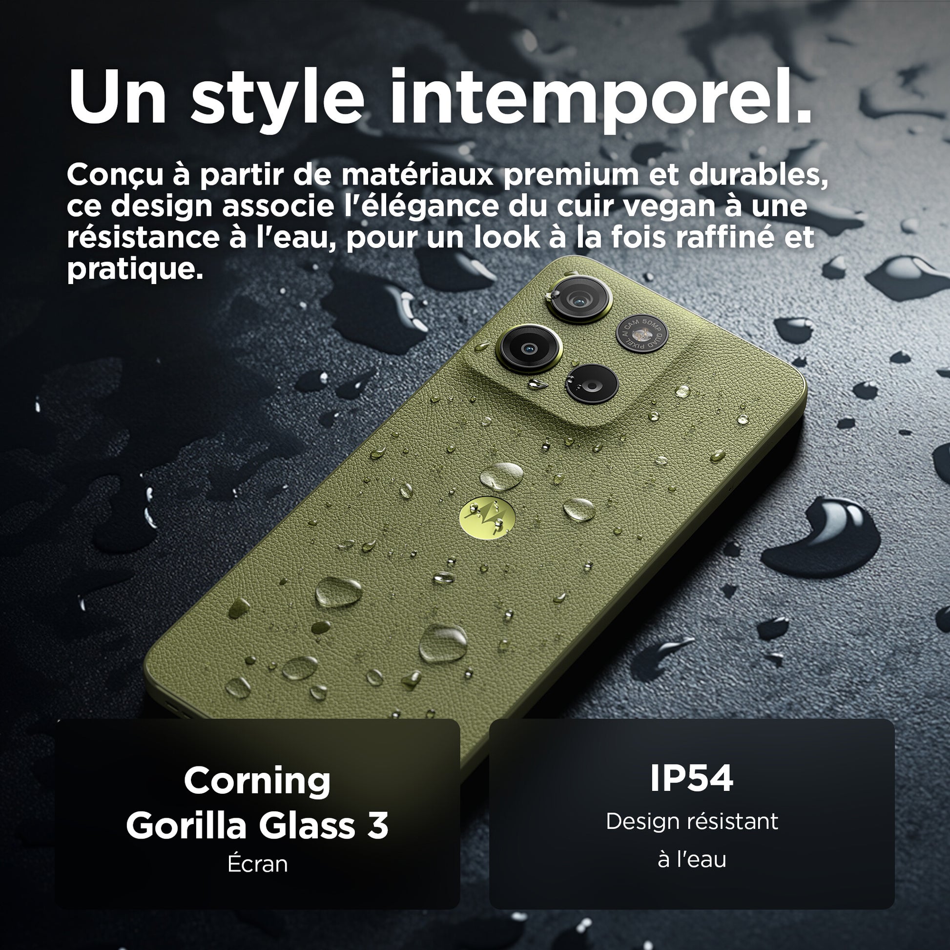 Le moto g15 vous offre le meilleur du divertissement cinématographique. Regardez vos émissions et films préférés sur un écran Full HD+ ultra net et lumineux de 6,72", même en plein soleil. Plongez dans un son multidirectionnel grâce aux puissants haut-parleurs stéréo avec Bass Boost et Dolby Atmos®. Capturez des photos magnifiquement détaillées avec l’appareil photo de 50 MP(1), éliminant les barres disgracieuses dues aux sources de lumière artificielle. Rechargez rapidement votre smartphone grâce au chargeur TurboPower™(2) et profitez d’une autonomie prolongée avec une batterie de 5 200 mAh. Le cuir vegan lui confère un style haut de gamme et son design résistant aux éclaboussures(3) et le verre Corning® Gorilla® Glass 3 renforcent sa protection. Bénéficiez de performances rapides et d’une grande capacité de stockage pour ne jamais être à court d’espace pour vos divertissements. Vivez chaque jour plus intensément avec le moto g15.